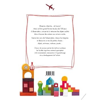 Plus de 100 jeux pour développer le sens de l'observationObserve, cherche… et trouve ! Avec ce livre grand format et plus de 100 jeux d'observation, amuse-toi à retrouver les objets cachés dans chacune des scènes aux univers variés.Exerce ton sens de l'observation, résous les énigmes et découvre un tas de petites choses : objets, animaux, voitures, jouets…Chacun de ces jeux permet de mettre en pratique les facultés cognitives comme la perception et le raisonnement, nécessaires à l'apprentissage et au développement de l'enfant.